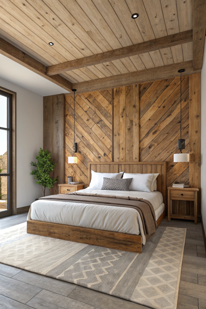 The wood warmth softens modern bedrooms and adds character to new construction. The material choice connects indoor spaces with nature beautifully.
