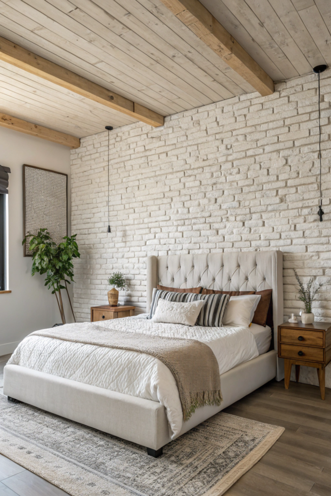 Exposed brick, stacked stone, or stone veneer creates textured master room bed back wall design bedroom with rustic or industrial character. The dimensional surfaces add authentic architectural interest.