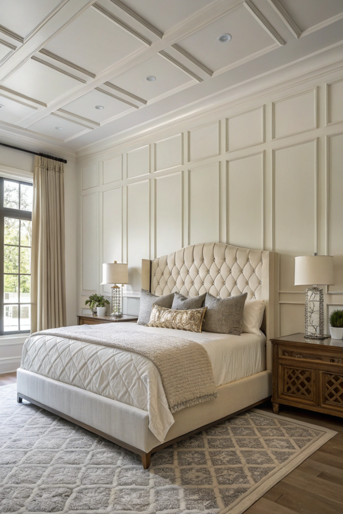 Painted white or contrasting colors, paneling suits traditional and transitional bedrooms beautifully. Symmetrical patterns create formal sophistication while asymmetric modern panels deliver contemporary edge.