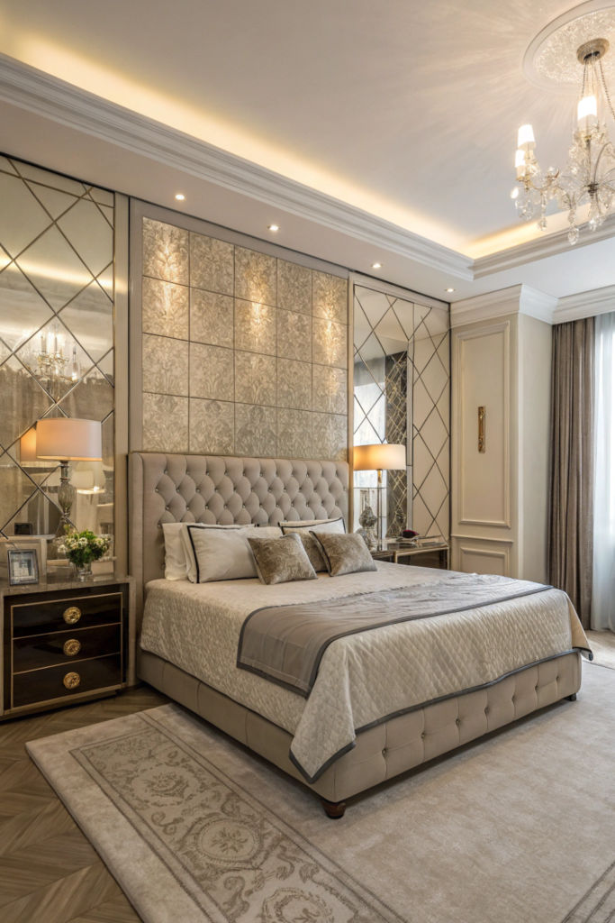 Mirrored panels, metallic tiles, or reflective wallpaper create glamorous master room bed back wall design bedroom with light-multiplying properties. The reflective surfaces expand perceived space while adding luxury.