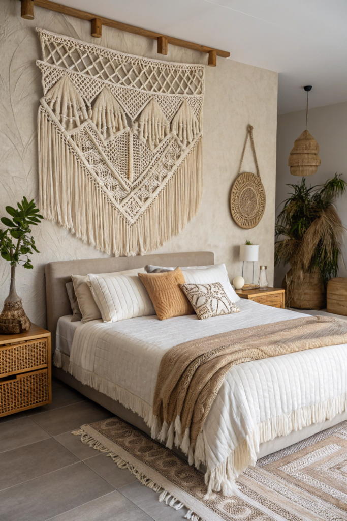 Large-scale tapestries, macramé, or fabric panels create bohemian master room bed back wall design bedroom with artisanal warmth. The textile art adds softness and personality through handcrafted beauty.