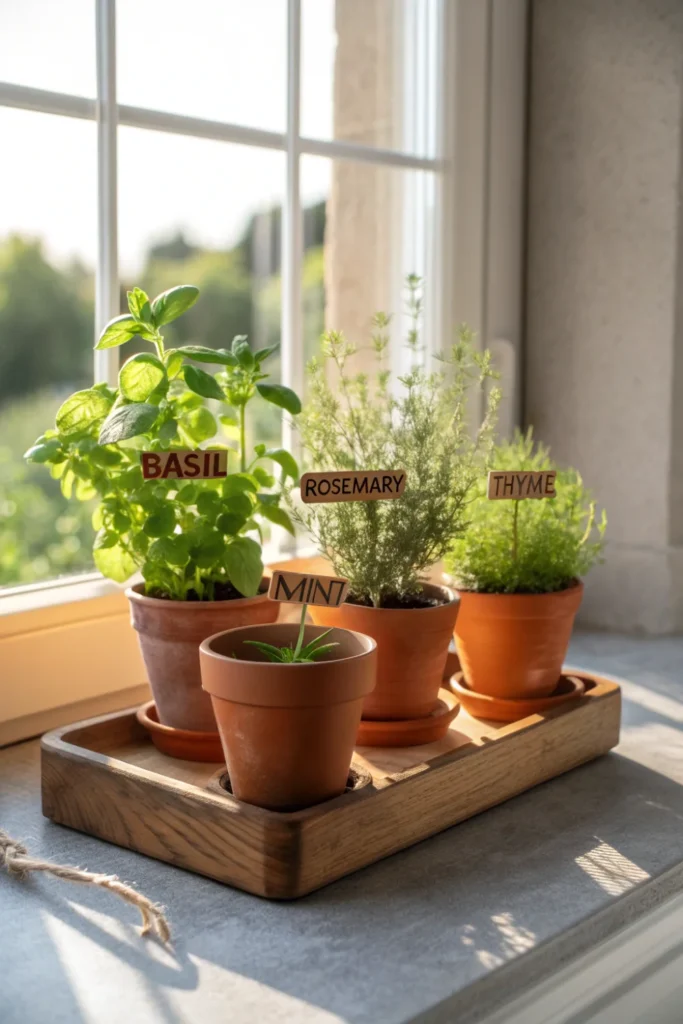 A styled kitchen herb garden — three or four potted herbs in matching terracotta or enamel pots on a wooden tray — is one of the most practical and charming Mother’s Day home decoration ideas for mums who love to cook.