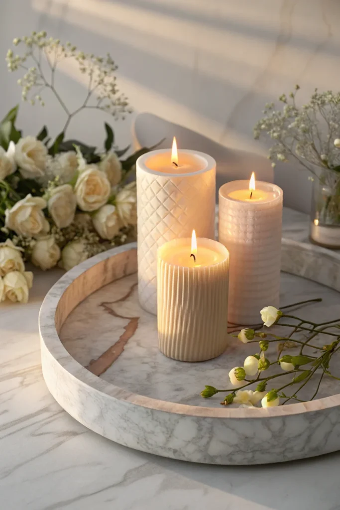 A curated candle display — three to five candles of different heights arranged on a decorative brass, marble, or wooden tray — is one of the most elegant and accessible Mother’s Day home decoration ideas that doubles as a genuine gift.