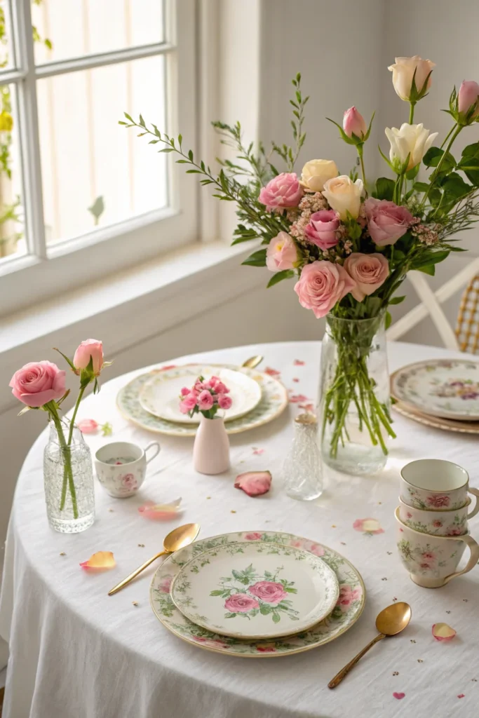 Use a linen tablecloth, mismatched vintage plates, a small bud vase at each place setting, and scattered rose petals or herb sprigs along the centre. Paper napkins with a floral print and personalised name cards elevate the experience without requiring expensive tableware.