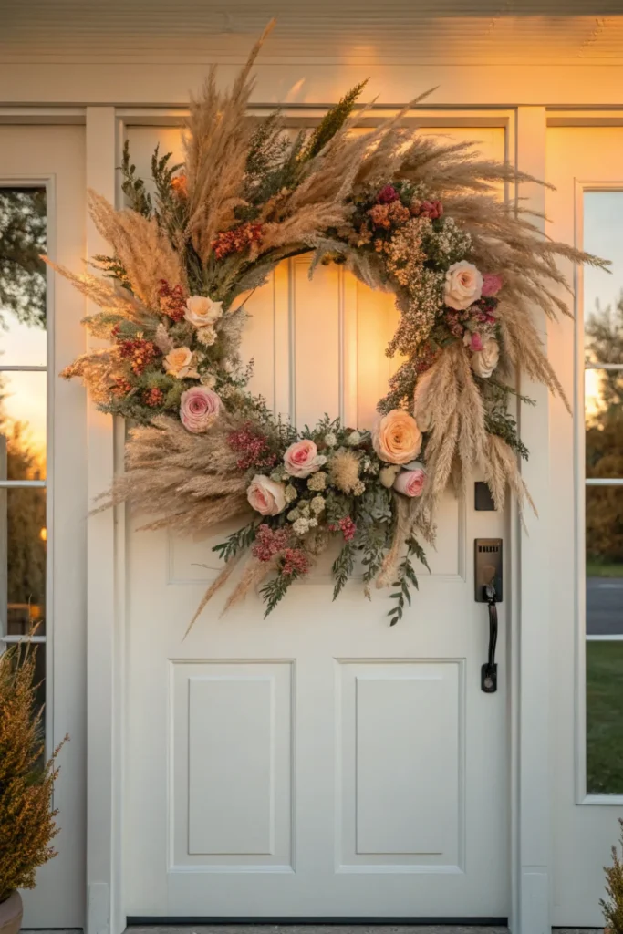 A dried flower wreath crafted from pampas grass, dried roses, lavender, and eucalyptus is one of the most long-lasting and visually striking Mother’s Day home decoration ideas — it stays beautiful for months or even years with no maintenance required.