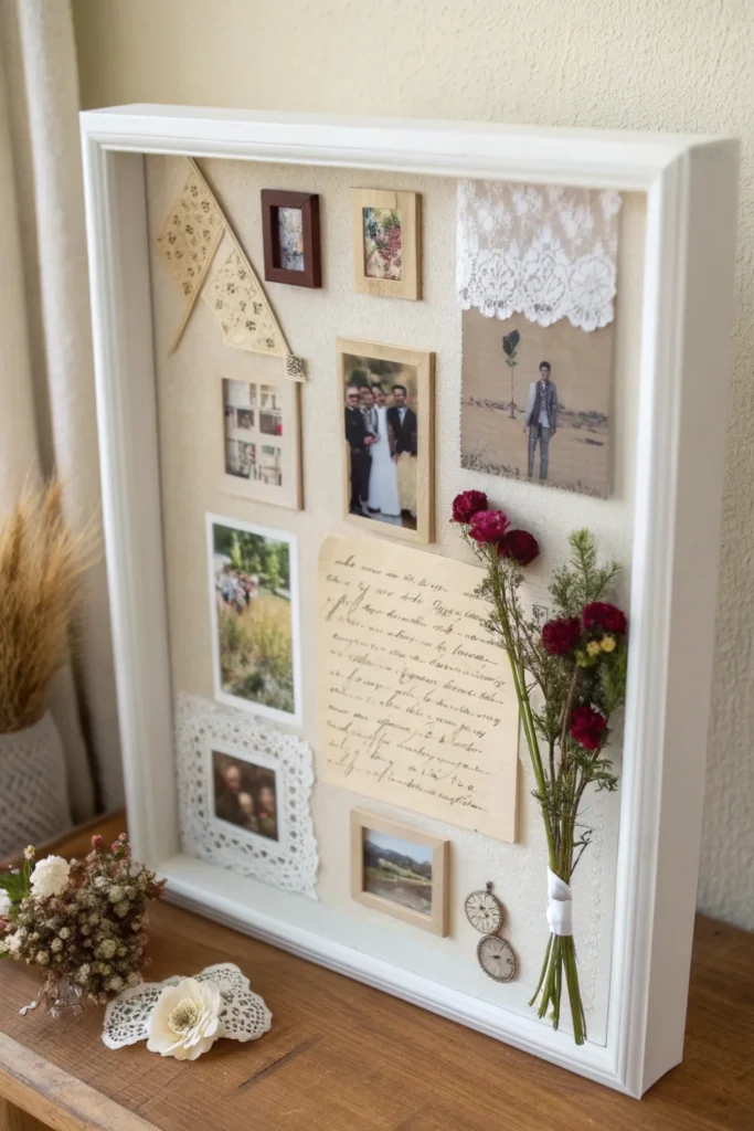 A shadow box — a deep-framed display case filled with meaningful objects, photos, fabric swatches, dried flowers, and small mementos — is one of the most emotionally powerful Mother’s Day home decoration ideas you can create.