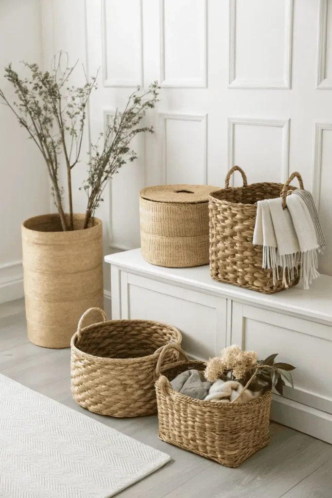 Natural woven baskets organize necessities while adding organic texture to simple home decor spaces. The neutral tones and handcrafted quality feel intentional rather than utilitarian.