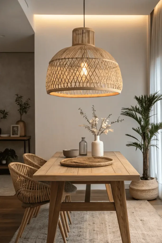 Natural materials like rattan, wood, or brass complement minimalist aesthetics beautifully. Sculptural shapes provide artistic interest that functions as both light and art.