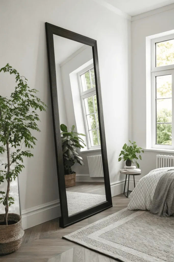 Floor-leaning mirrors add architectural interest without wall commitment. The casual placement feels less formal than hung mirrors while providing full-length utility.