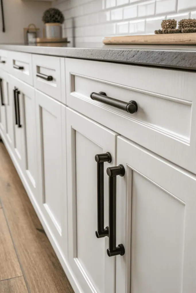 Pinterest Image Prompt: Vertical 2:3 image showing kitchen with consistent matte black hardware on white cabinets, close-up detail of simple bar pulls, cohesive finish, clean lines, simple home decor detail, intentional hardware choice