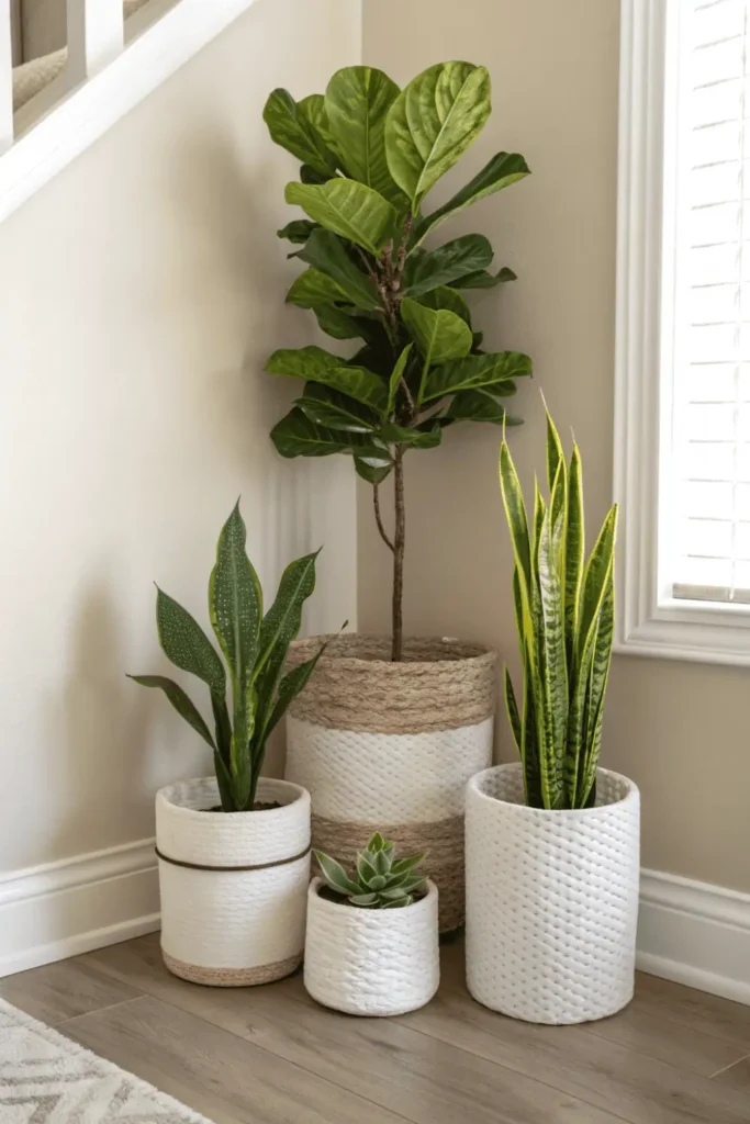 Choose low-maintenance varieties suited to your light conditions and watering commitment. Simple ceramic or woven basket planters enhance rather than distract from the plants themselves.