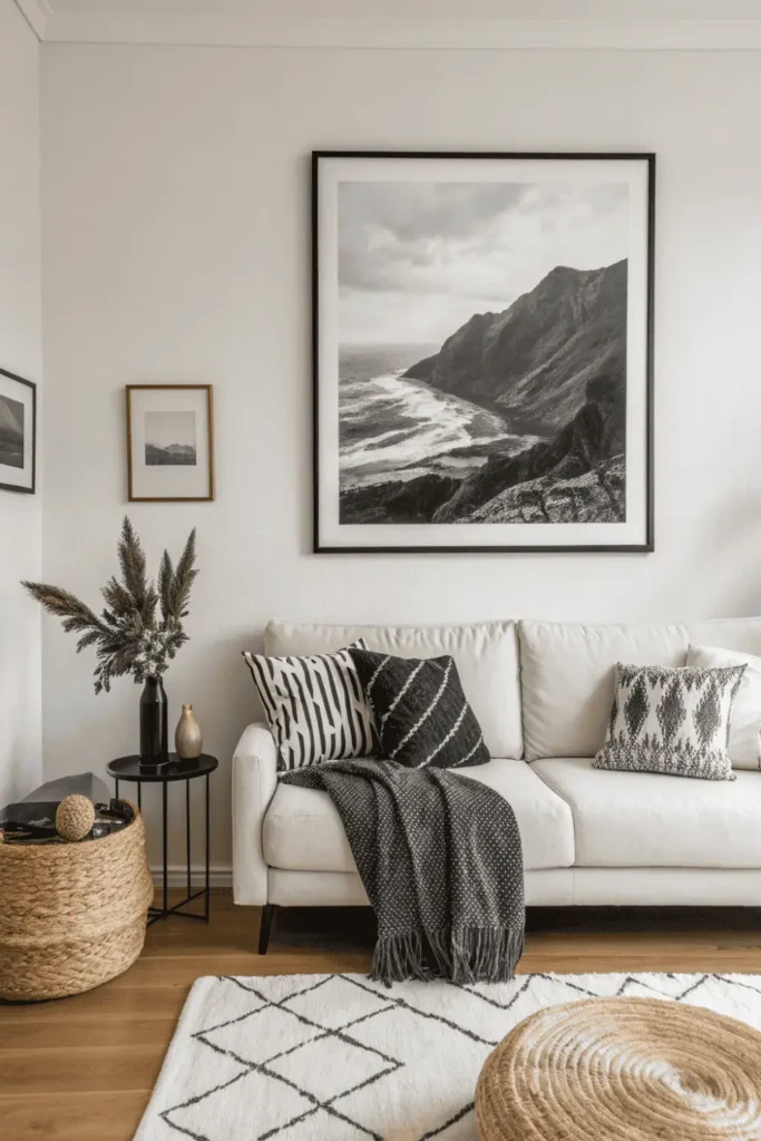 Large-scale black and white photography or minimal abstract prints create focal points in simple home decor without overwhelming spaces. Single statement pieces prove more impactful than gallery walls in minimalist schemes.
