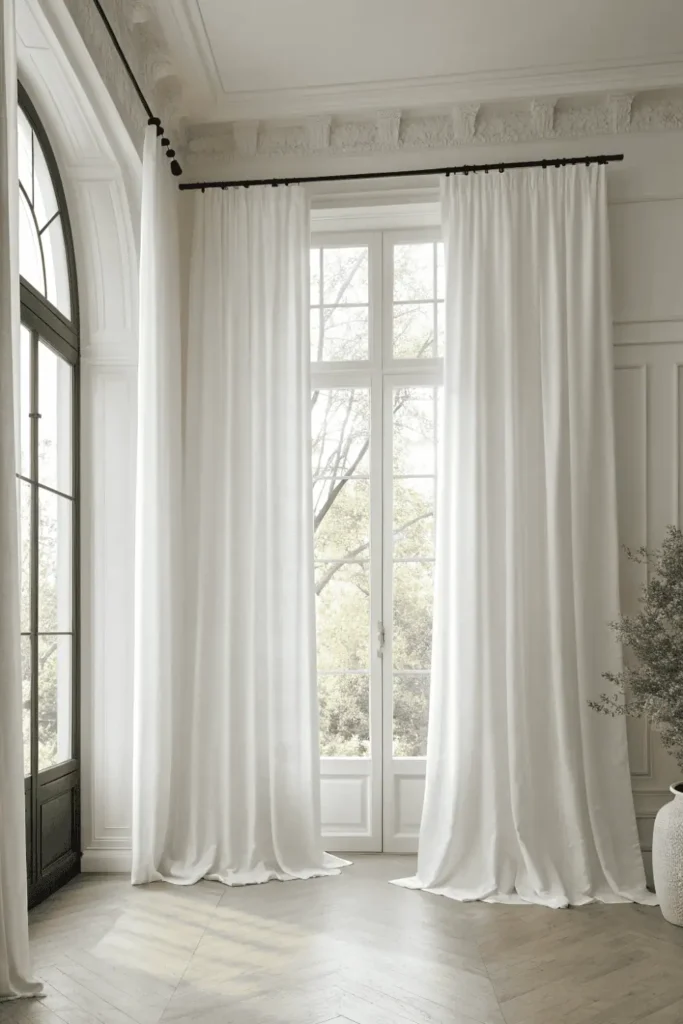 White or natural linen curtains filter light beautifully while maintaining simple home decor elegance. Floor-length panels add architectural height without fussy valances or elaborate hardware.