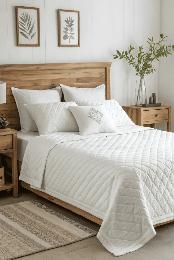 All-white or cream bedding creates hotel-like serenity in bedrooms following simple home decor principles. Crisp sheets, duvet covers, and pillowcases in quality natural fibers invite restful sleep.