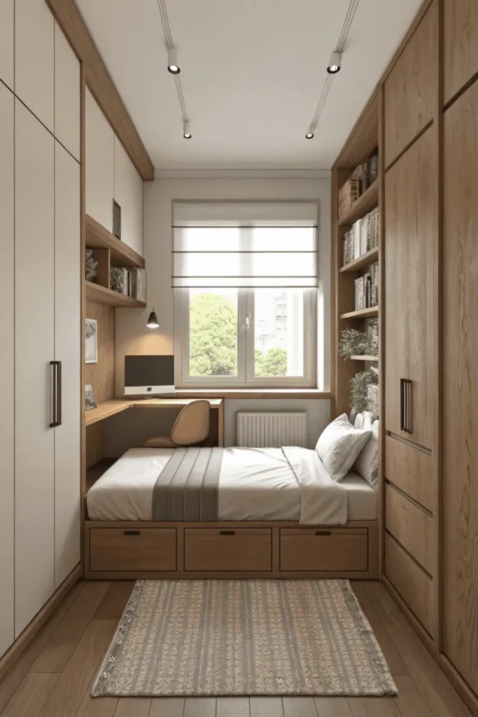 Pro Tip: Leave at least 24 inches of walking space between the bed and desk for comfortable access to both, and position the desk near the window for natural task lighting in your bed and desk layout small room.