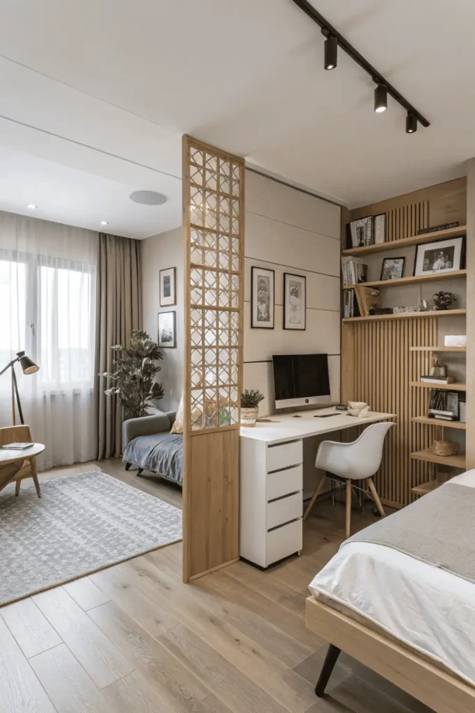 Physical dividers like bookcases, curtains, or positioned furniture create visual separation between bed and desk areas in bed and desk layout small room spaces. Even low barriers help mentally distinguish zones.