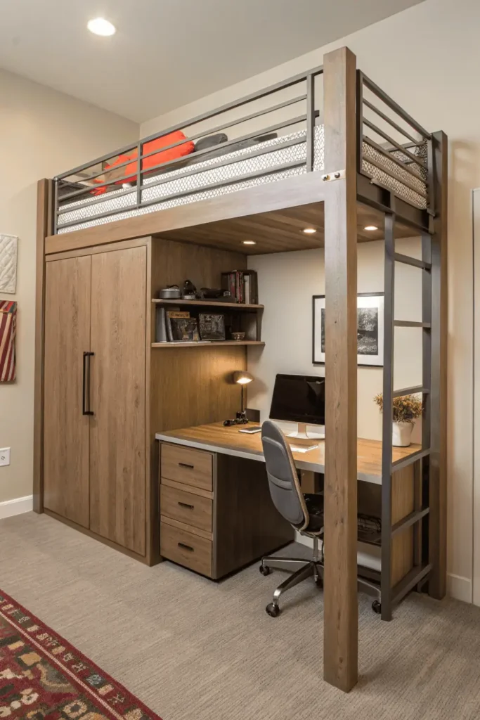 | Bunk with Lower Desk | High – vertical | $$-$$$ | Medium – assembly | Low – permanent structure | Guest rooms, kids |
