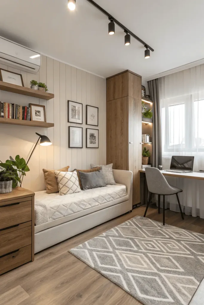 Pro Tip: Style daybeds with throw pillows against the wall to emphasize sofa qualities during daytime, and position your desk to face away from the bed to mentally separate work and sleep zones in your bed and desk layout small room.