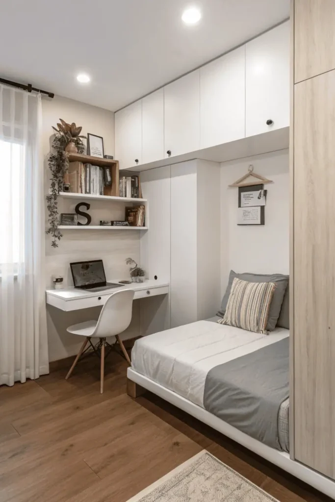 Corner bed placement maximizes usable floor space while wall-mounted floating desk consumes zero floor area in tight bed and desk layout small room configurations. The strategic positioning preserves movement despite limited square footage.
