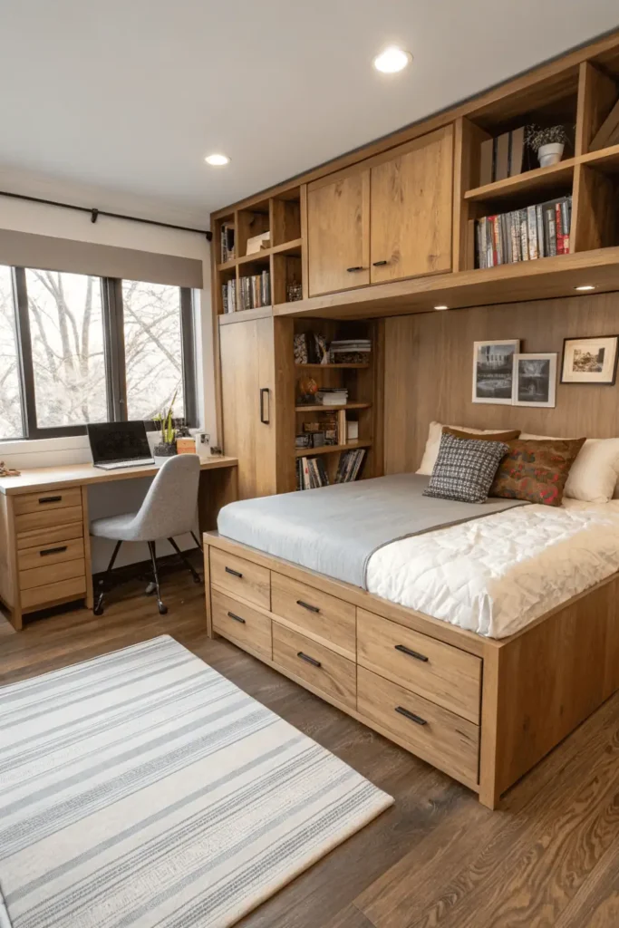 Storage beds with built-in drawers pair with pull-out or slide-out desk extensions for compact bed and desk layout small room solutions. The hidden desk deploys when needed and tucks away afterward.