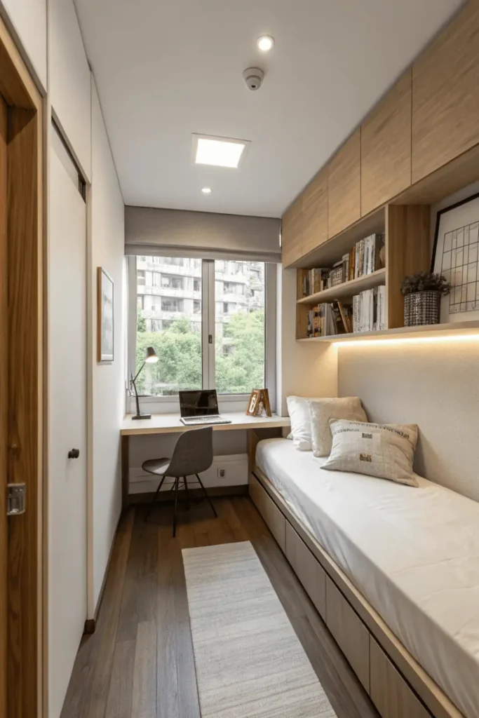 Side-by-side placement of twin bed and narrow desk along same wall creates streamlined bed and desk layout small room in extremely tight quarters. The linear arrangement preserves central floor space for movement.