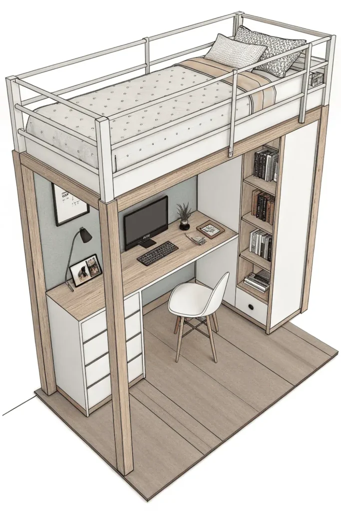 Pro Tip: Ensure at least 38-42 inches of clearance between loft mattress and ceiling for comfortable sitting up in bed, and install task lighting under the loft for proper workspace illumination in your bed and desk layout small room.