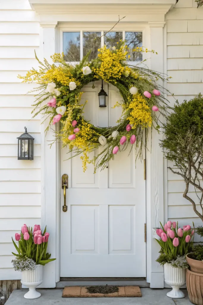 A spring floral wreath welcomes guests and celebrates the season from your home’s exterior. Fresh or high-quality faux options featuring tulips, daffodils, forsythia, and greenery make powerful first impressions.