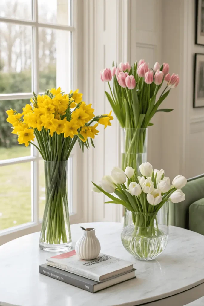 Nothing captures spring’s essence quite like fresh-cut flowers in clear glass vases. Tulips and daffodils offer vibrant pops of color while their stems create beautiful visual lines through transparent containers.