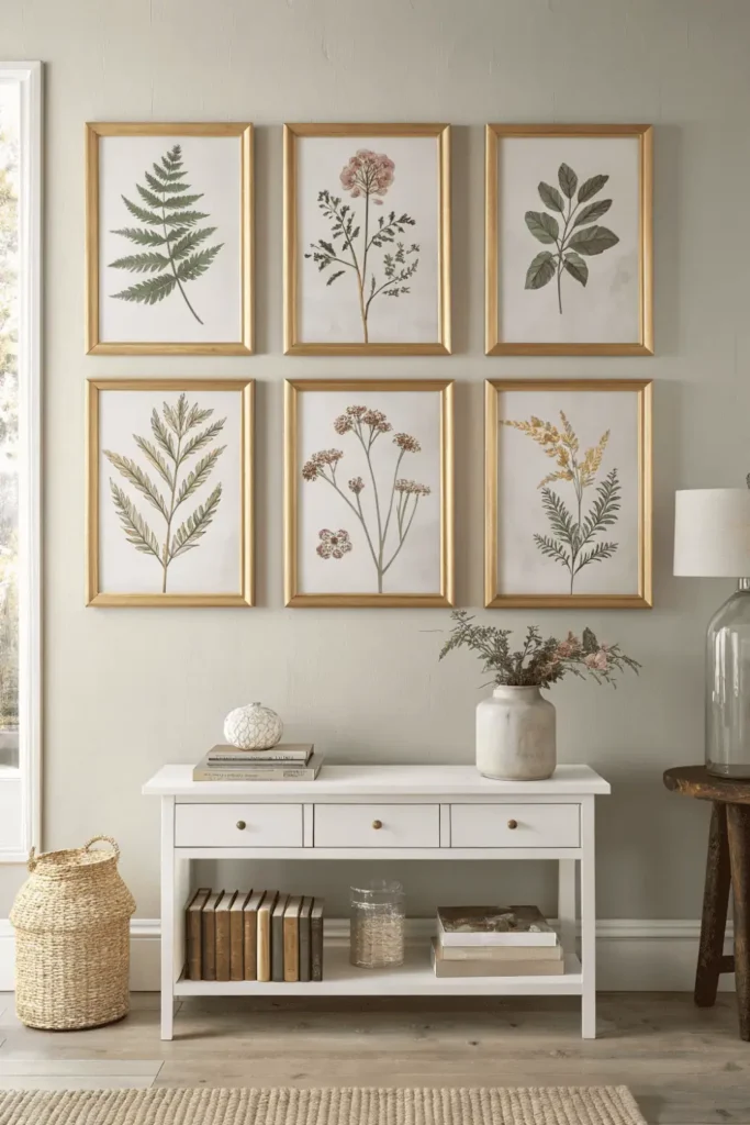 Creating a gallery wall with mixed botanical prints allows you to customize your spring home decor to match your specific color palette. Frames in natural wood, white, or gold coordinate with various interior styles.