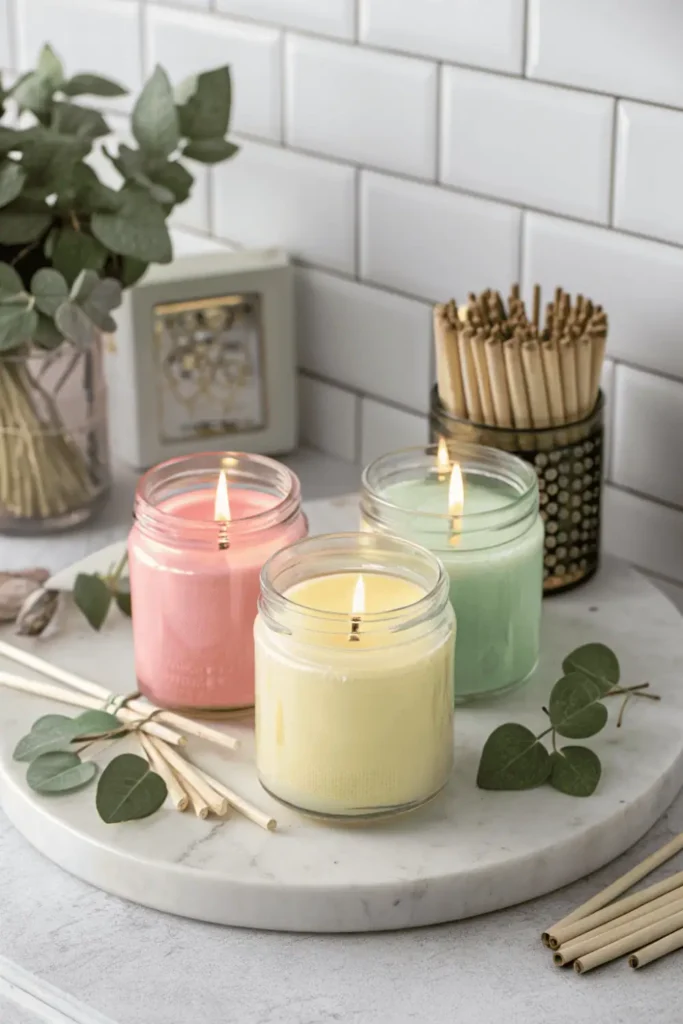 Choose candles in glass vessels that complement your color scheme—clear, frosted, or pastel containers work beautifully. Strategic placement in living areas, bedrooms, and bathrooms creates cohesive sensory experiences.