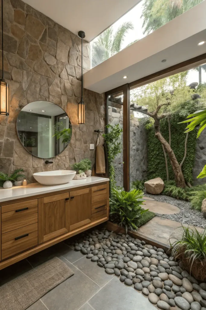 Live-edge wood vanities, river rock flooring, and natural stone walls bring outdoor beauty inside authentically. The textures add dimension that manufactured materials cannot replicate.