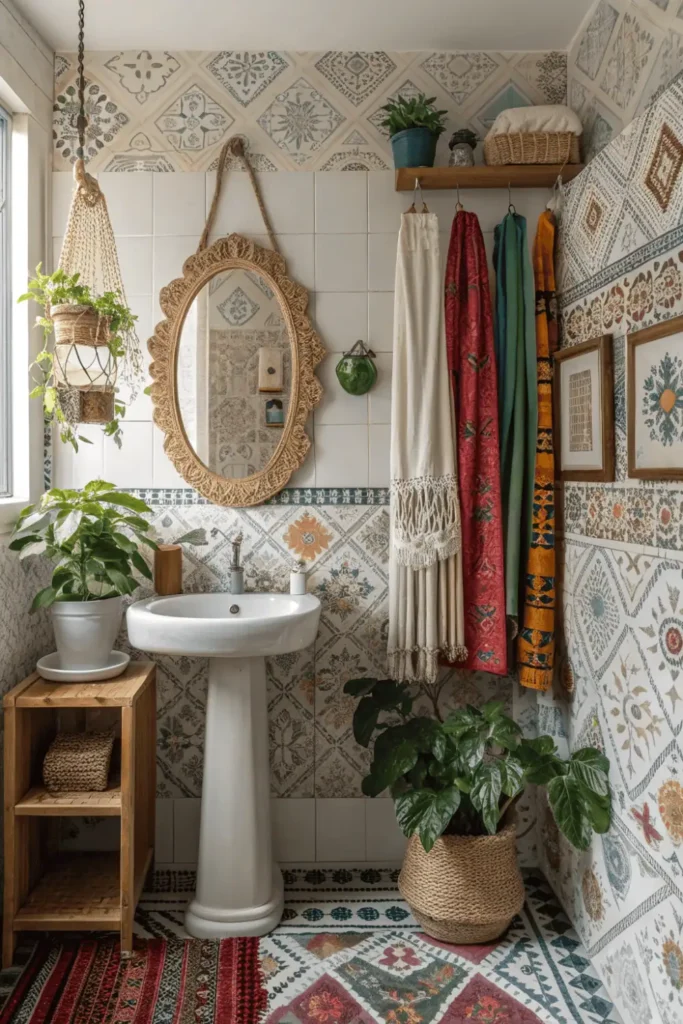 Pattern mixing, global textiles, and collected treasures create personality-filled washroom interior design for free spirits. The layered approach reflects individual style authentically.