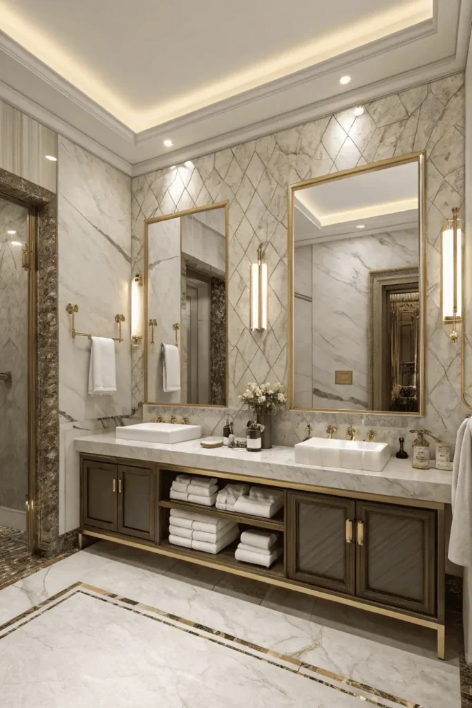 Geometric patterns, metallic finishes, and luxurious materials recreate 1920s-1930s glamour in washroom interior design. The opulent style delivers Hollywood regency sophistication.