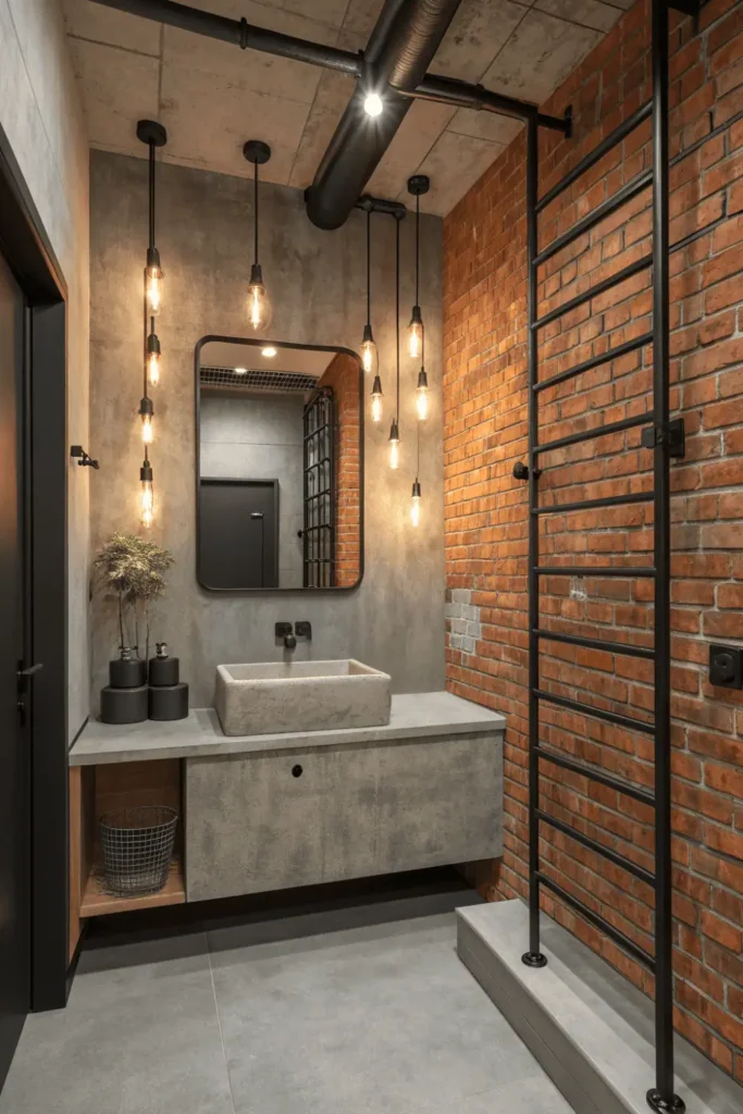 Pro Tip: Leave one brick or concrete wall exposed while finishing others with paint or tile to incorporate industrial elements without overwhelming your washroom interior design with harsh textures.