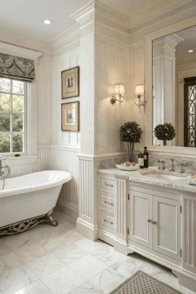 Wainscoting, crown molding, and traditional fixtures create timeless washroom interior design that honors architectural heritage. The formal approach suits period homes and those appreciating classical beauty.