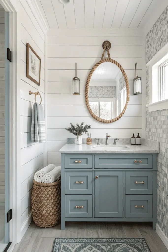 Soft blues, whites, and natural textures evoke seaside serenity in coastal washroom interior design. The relaxed aesthetic brings vacation feelings into everyday life.