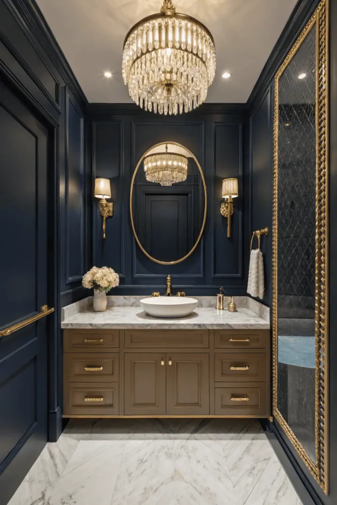 Navy, forest green, charcoal, or black walls provide rich backgrounds for metallic fixtures and marble surfaces. The depth creates intimate, jewel-box atmospheres.