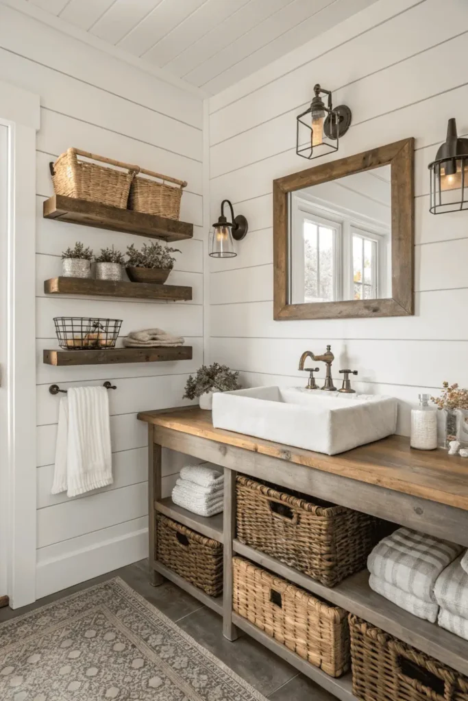 Pro Tip: Mix new shiplap or beadboard with one or two authentic reclaimed elements like a barn door or vintage mirror to achieve authentic farmhouse character in your washroom interior design affordably.