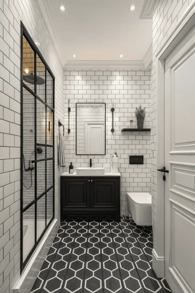| Contemporary Monochrome | $$-$$$ | Medium – white shows dirt | Excellent – timeless | Modern homes, graphic taste | Black and white tile, matte fixtures |