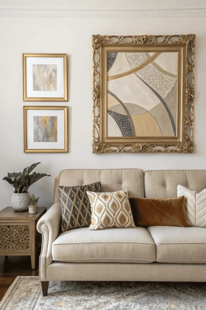 Abstract pieces and landscapes work universally, while outdated prints can be replaced with downloadable art in thrifted frames. The original oil paintings and watercolors occasionally discovered at thrift stores represent significant savings versus gallery prices.