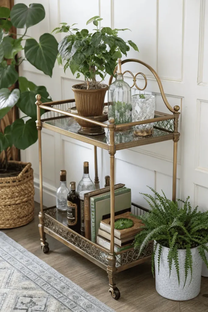 Use bar carts in unconventional ways—bathroom storage, plant displays, or coffee stations. The wheels provide flexibility while tiered surfaces maximize vertical space. Polish metals and clean glass for instant glamorous transformation.