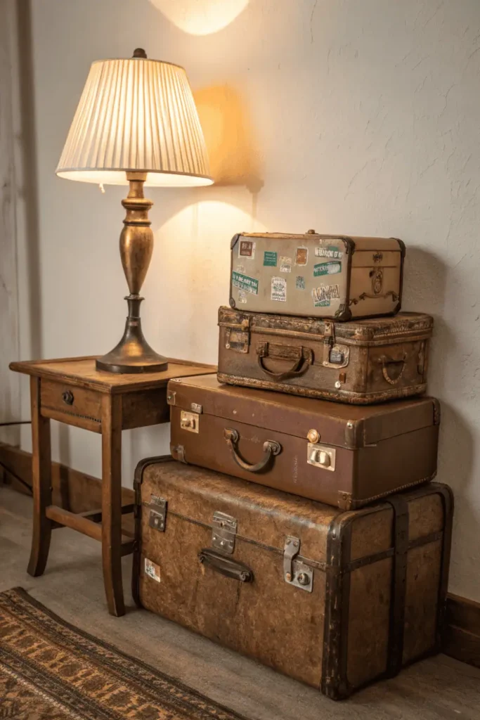 Old suitcases and trunks create nostalgic thrifted home decor stacked as side tables, displayed on shelves, or providing hidden storage, typically $10-40. The worn leather, vintage hardware, and travel stickers evoke adventure and bygone eras.