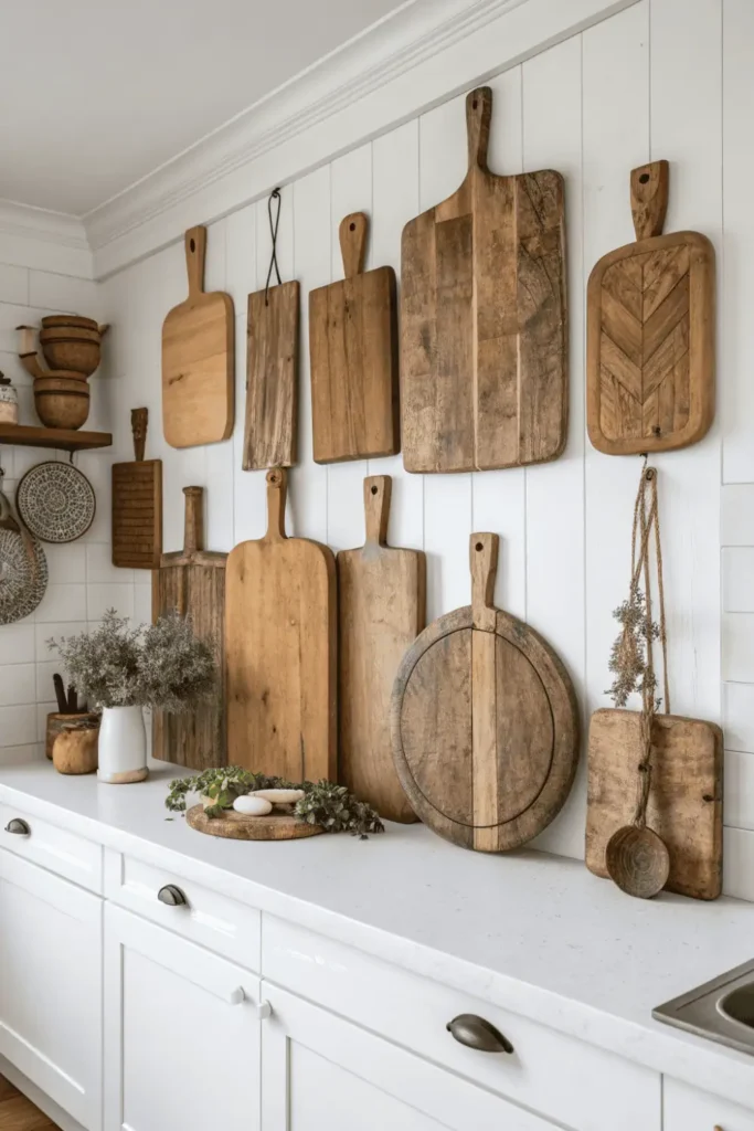 Arrange multiple boards gallery-wall style or hang single statement pieces. The functional objects-as-art approach adds warmth and texture while celebrating utilitarian beauty. Some boards feature burnt-wood designs or branded text adding character.