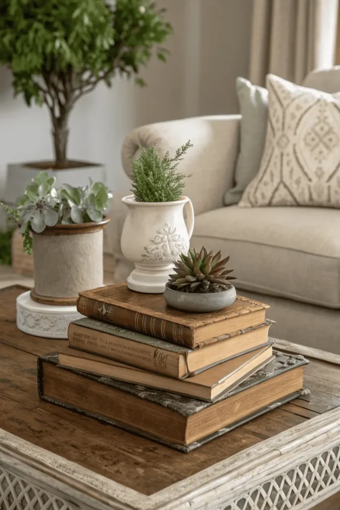 Old hardcover books function as versatile thrifted home decor priced typically $1-3 each, perfect for creating height variations under plants and objects or stacking as decorative elements. Look for interesting spines, vintage colors, or leather-bound editions that add intellectual charm.