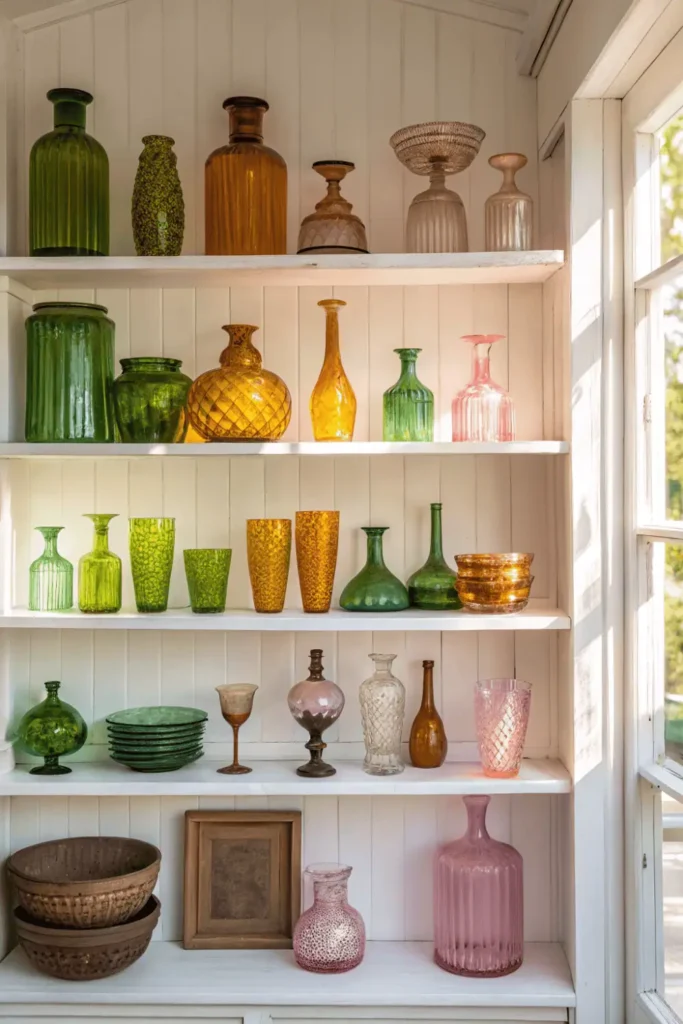 Colorful vintage glassware adds cheerful thrifted home decor to open shelving and table settings at $1-4 per piece. Hunt for Depression glass, colored goblets, etched tumblers, or patterned cocktail glasses that bring personality to everyday use.