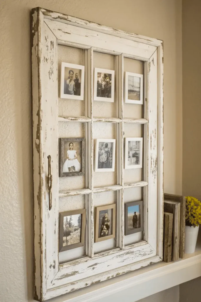 The divided panes create built-in grids for displaying multiple photos or prints. Leave paint chippy for authentic vintage appeal or refresh with new paint. Larger windows become statement pieces leaning against walls.