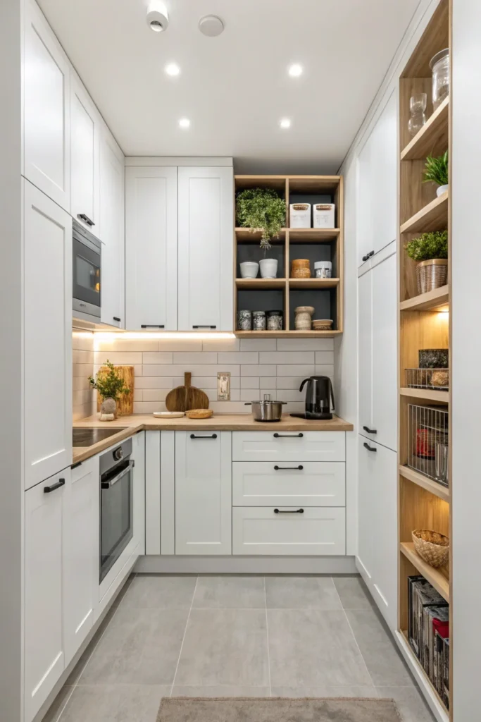 Floor-to-ceiling cabinets and shelving utilize often-wasted vertical space in tiny kitchen design, dramatically increasing storage capacity. The upward focus draws eyes ceiling-ward, creating height illusion.