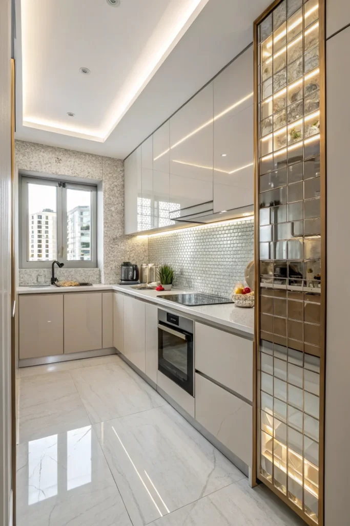 Mirrored backsplashes or glossy tiles multiply light and expand perceived space in tiny kitchen design. The reflective surfaces brighten rooms while creating depth illusions.