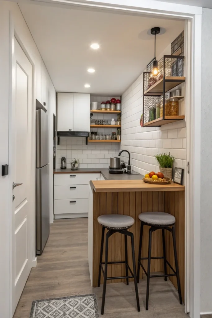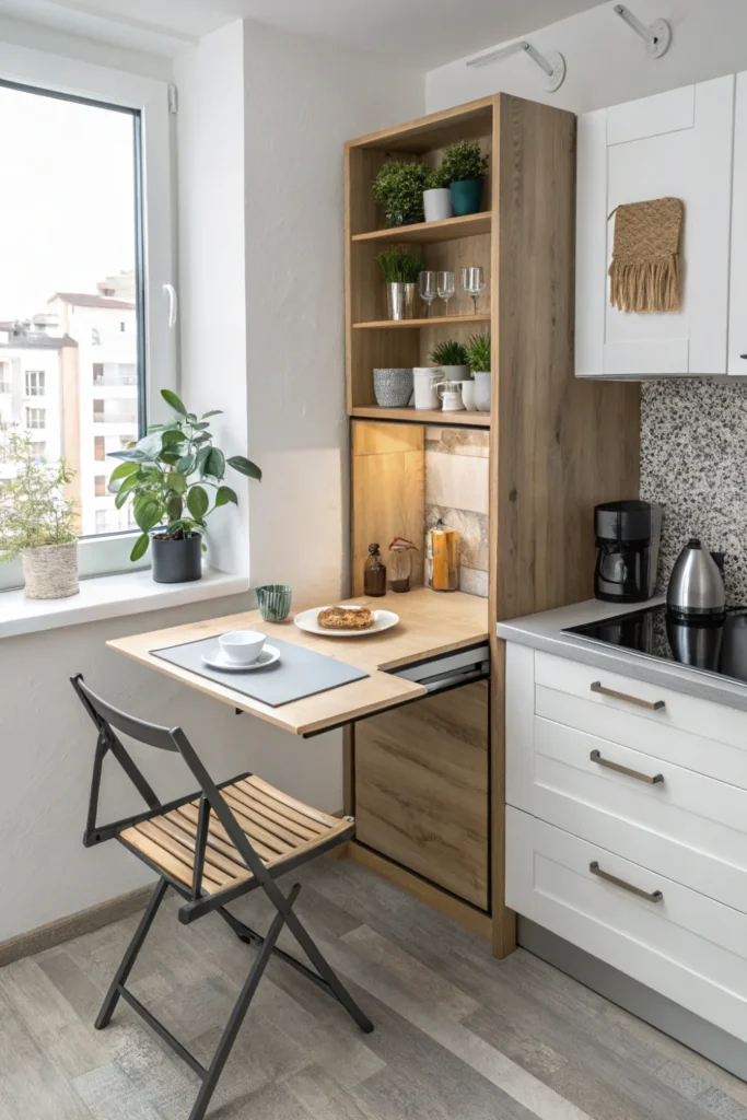 Pro Tip: Install fold-down surfaces at standard counter height (36 inches) in your tiny kitchen design with sturdy brackets rated for at least 100 pounds to safely hold prep work and small appliances.