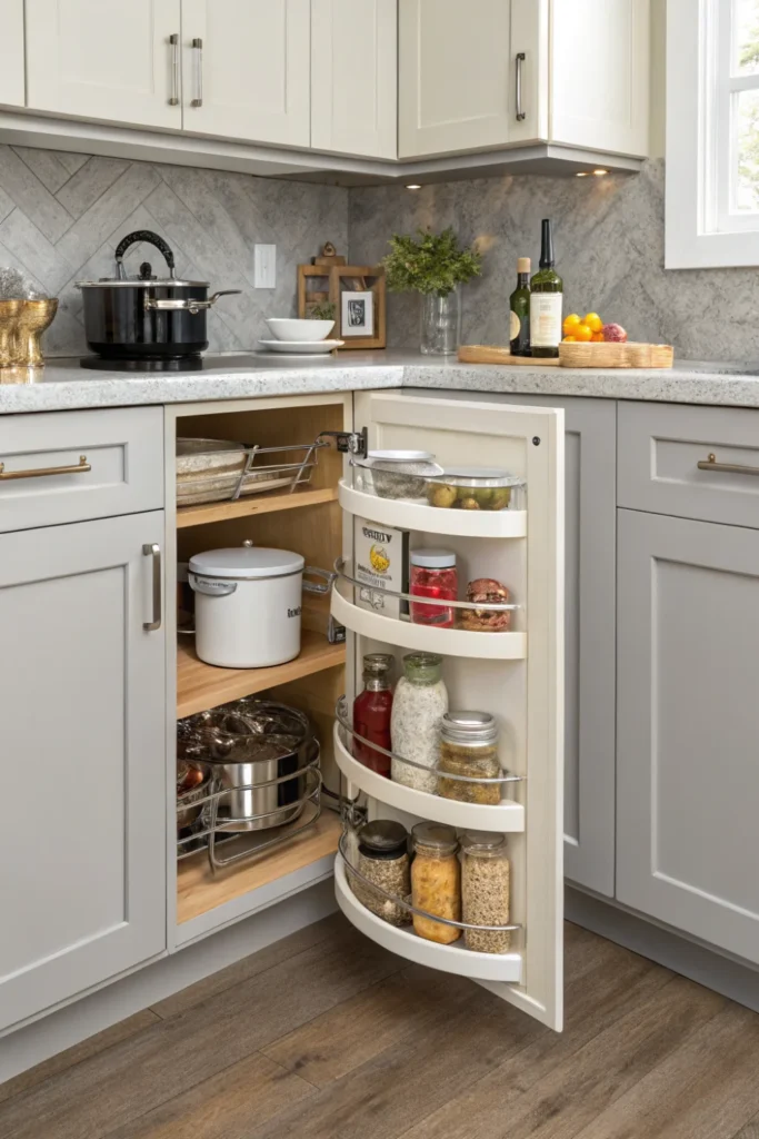 Lazy Susans, pull-out shelves, or swing-out organizers make corner cabinets functional in tiny kitchen design. These awkward spaces become accessible rather than black holes for lost items.